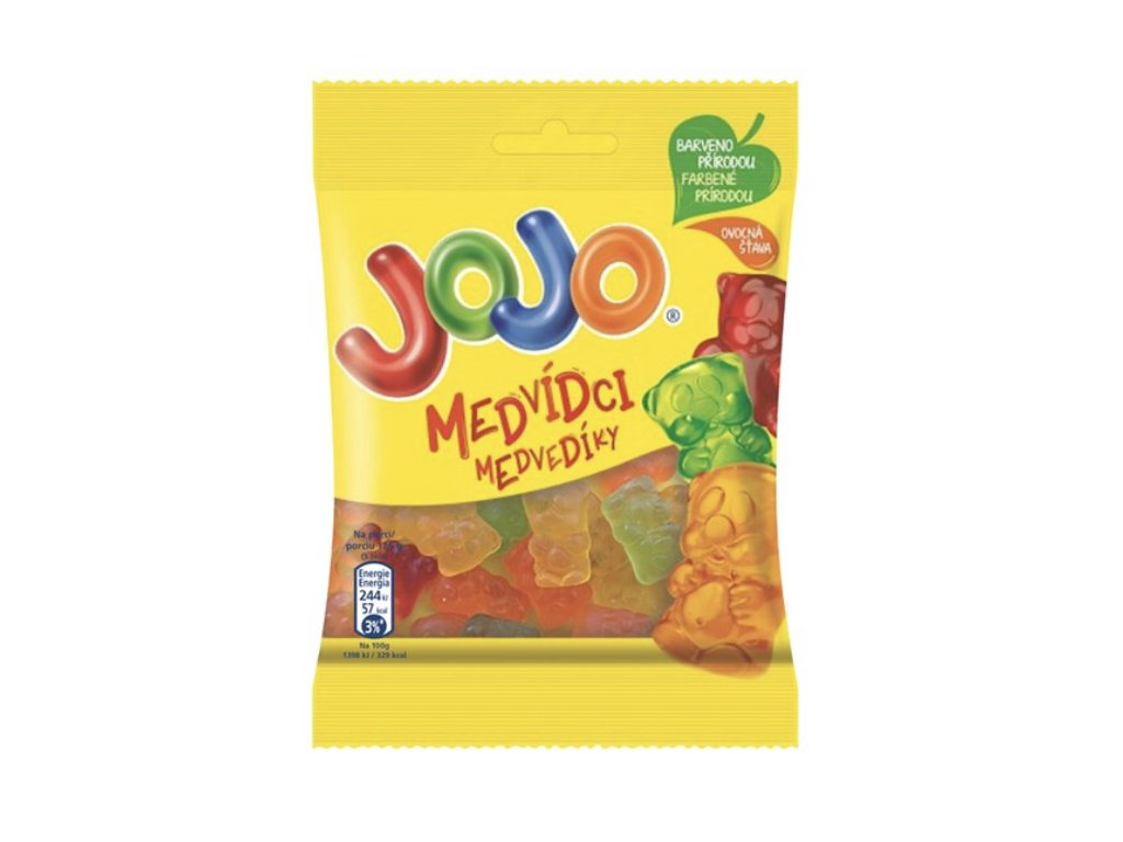 glukózový sirup, cukor, želatína, jablčná šťava z koncentrátu 5, 5 %, kyseliny (kyselina citrónová, vínna, jablčná), arómy (jablko, citrón, jahoda, pomaranč), rastlinné koncentráty (reďkovka, požlt farbiarsky, čierna mrkva), koncentrát spiruliny, palmový olej** 0, 1 %, povlaková látka (karnaubský vosk), regulátor kyslosti (askorban sodný), farbivo (karotény), **Palmový olej je použitý z certifikovaných zdrojov. Viac informácií na: www.jojo.sk